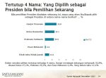 Dalam simulasi tertutup 4 nama di mana yang maju adalah Airlangga Hartarto, Anies, Ganjar, dan Prabowo, Ganjar konsisten unggul dengan perolehan suara 32,4 persen; disusul Anies 26,8 persen; Prabowo 25,6 persen; dan Airlangga 3 persen. Masih ada 12,1 persen yang belum menentukan pilihan.