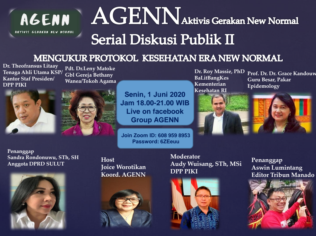Besok, Diskusi Virtual AGENN Serial II Bahas Protokol Kesehatan Era New Normal Manado, Update Covid-19 Sulut|31 May 202031 May 2020by Jeane Rondonuwu SULUTDAILY|| Manado- Pandemi Covid-19 telah membentuk sebuah tatanan baru bagi masyarakat. Sosialisasi