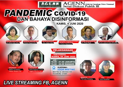 Sore ini Diskusi Virtual AGENN Bertajuk ‘ Pandemi Covid-19 dan Bahaya Disinformasi Manado, Update Covid-19 Sulut|4 June 20204 June 2020by Jeane Rondonuwu SULUTDAILY|| Manado-Tidak ada satu negara yang siap dan menyiapkan diri menghadapi pandemik