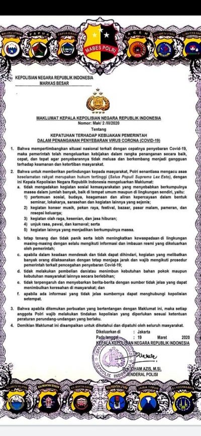 Kapolri Keluarkan Maklumat Antisipasi Penyebaran Covid-19 Nasional, Pemerintahan|22 March 202022 March 2020by admin@manado Foto – Maklumat Kapolri