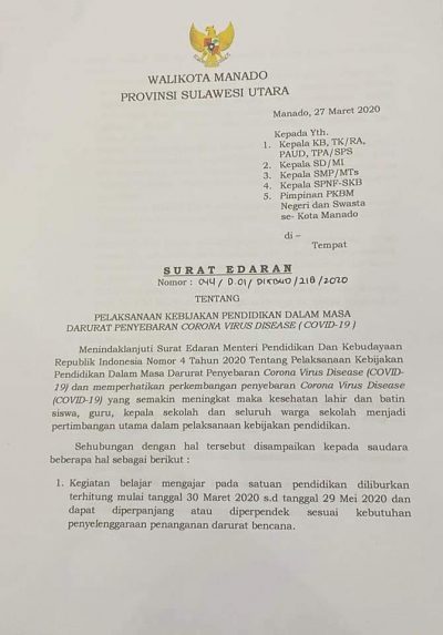 Cegah Covid -19, Belajar dari Rumah bagi SD/SMP se-Kota Manado Diperpanjang Hingga 29 Mei Pendidikan, Update Covid-19 Sulut|27 March 202027 March 2020by Jeane Rondonuwu SULUTDAILY|| Manado- Wali Koa Manado, DR. Ir. GS Vicky Lumentut, SH! M.Si,