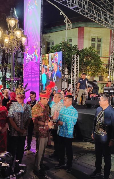 Foto – Sekda Kota Bitung Didampingi Kadis Pariwisata Kota Bitung saat Menerima Plakat dan SK Kota Kreatif Subsektor Kuliner.