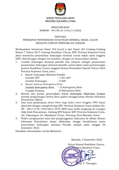 KPU Sulut Resmi Umumkan Penerimaan Berkas Bakal Calon Anggota DPD Politik|8 December 20228 December 2022by Jeane Rondonuwu SULUTDAILY||Manado-Komisi Pemilihan Umum (KPU) Provinsi Sulawesi Utara (Sulut) saat ini telah masuk