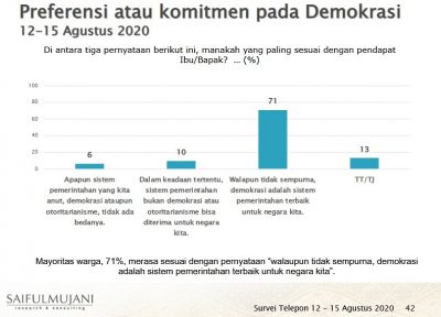 Saiful Mujani: 71% Warga Mendukung Demokrasi Nasional|23 August 202023 August 2020by admin@manado SULUTDAILY||Jakarta – Setelah 6 bulan mengalami pandemi Covid-19, publik umumnya tetap puas