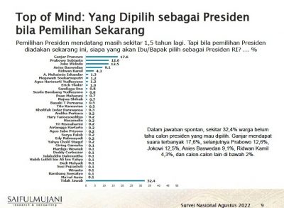 SMRC: Ganjar Pranowo Unggul Atas Semua Tokoh yang Potensial Maju Sebagai Calon Presiden Politik|21 August 202221 August 2022by redaksi sd SULUTDAILY||Jakarta – Ganjar Pranowo semakin unggul menjelang Pilpres 2024. Demikian temuan survei