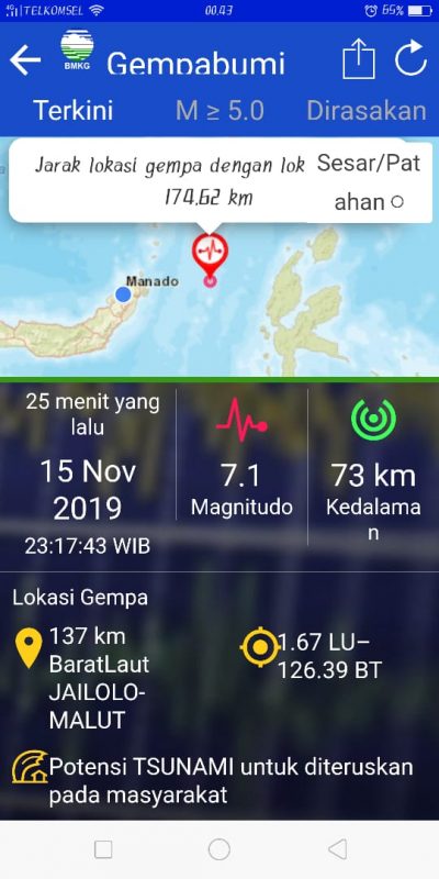 Manado Berdampak Gempa M=7,1 di Maluku Utara, 72 Kali Gempa Susulan Tekno|15 November 201915 November 2019by Jeane Rondonuwu Warga Diminta Tenang dan Hindari Bangunan yang Retak SULUTDAILY|| Hari Kamis, 14