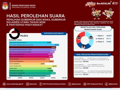 Rekapitulasi Hasil Perolehan Penghitungan Suara Pemilihan Gubernur dan Wakil Gubernur dan Tingkat Partisipasi Masyarakat. Infografis, Politik|7 December 202416 December 2024by Jeane Rondonuwu SULUTDAILY|| INFOGRAFIS- Berikut Rekapitulasi Hasil Perolehan Penghitungan Suara Pemilihan Gubernur dan Wakil