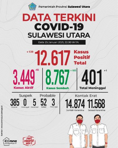 8.767 Warga Sulut Sembuh dari Covid-19 Update Covid-19 Sulut|26 January 202126 January 2021by Jeane Rondonuwu SULUTDAILY|| Manado- Jumlah pasien Covid-19 di Sulawesi Utara yang sembuh bertambah secara