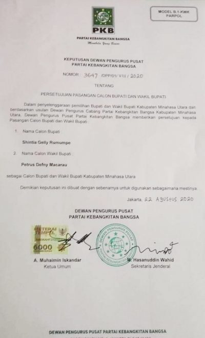 SK B1-KWK PKB, SGR-PDM Calon Bupati dan Wakil Bupati Minut Minut|29 August 202029 August 2020by redaksi sd SULUTDAILY|| Minut – DPP Partai Kebangkitan Bangsa (PKB) menyatakan resmi mendukung Pasangan