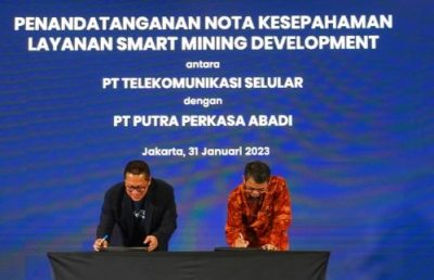 Direktur Sales Telkomsel Adiwinahyu B. Sigit dan Direktur HCGA & Legal PT. Putra Perkasa Abadi Raden Teguh Saptosubroto saat penandatanganan nota kesepahaman di acaraTelkomsel Enterprise Solution Day 2023