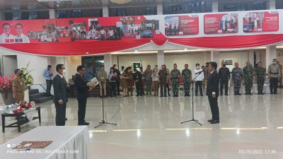 Foto – Wali Kota Bitung, Ir. Maurits Mantiri, MM yang Didampingi Oleh Wakil Wali Kota Bitung, Hengky Honandar, SE, saat Melantik Sekda Kota Bitung.