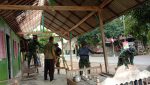 Tampak anggota Satgas TMMD bersama warga menurunkan atap genteng di lokasi RTLH Mudadi (66) Dusun Pandahan, Desa Tamansari, Kecamatan Jaken, Kabupaten Pati.