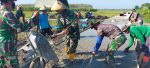 Suasana Pagi Hari yang sejuk menambah semangat untuk bekerja dan berkarya bagi Anggota Satgas dan Masyarakat, Dengan semangat mereka mulai kegiatan pengecoran jalan penghubung desa sepanjang 1.450 M dengan lebar 2,6 M dan ketebalan 17 cm mereka dengan alat angkong mengangkat hasil adukan dari mesin mulen betonisasi jalan. Dengan Angkong mereka sangat terbantu dalam pekerjaannya karenannya pekerjaan sangat terbantu dan menjadikan ringan suatu pekerjaan.